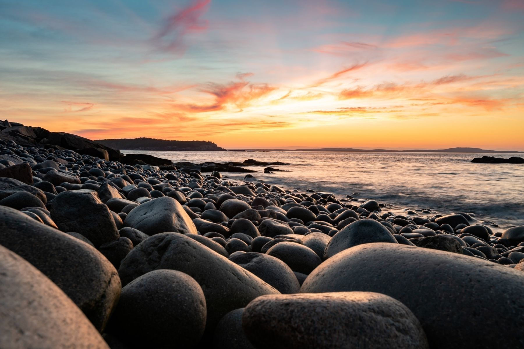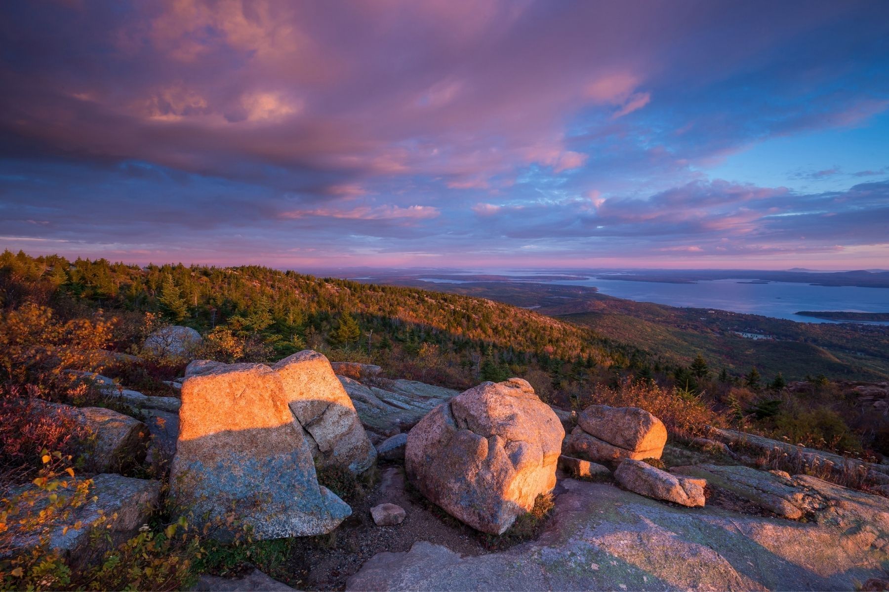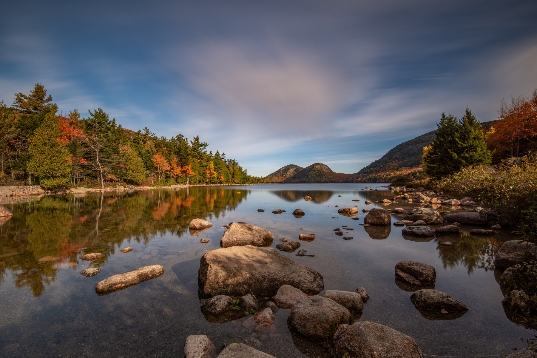 Fall is particularly spectacular in Acadia, as inland fall color melds with the jagged coastline, providing a large diversity of photography opportunities from mountain overlooks to beaches with polished boulders.